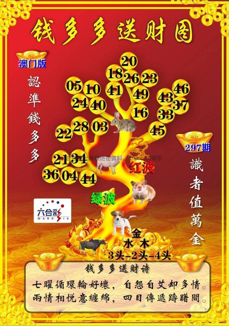 297期:【钱多多送财诗】 七曜循环轮好坏,自怨自艾却多情。两情相悦意缠绵,四目传递踌躇间。 综合六肖:兔龙猪鼠狗牛 综合双波:绿波+红波 |
