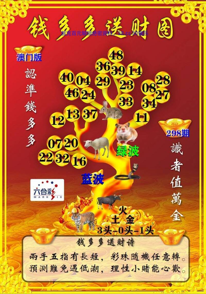 298期:【钱多多送财诗】 两手五指有长短,彩珠随机任意转。预测难免遇低潮,理性小赌能心欢。 综合六肖:兔鼠羊蛇牛虎 |